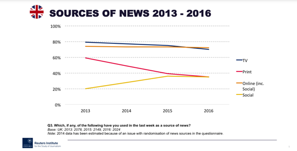 Recent years have seen the continuous decay of television as the only most popularly used source of news, to the point that by 2016 it has been passed by online sources (There were 63 million internet users in the UK by late 2017, nearly 95% of the population). The range of published newspapers has decreased quickly at the same time, and social media has become much more critical (Nielsen, 2018).